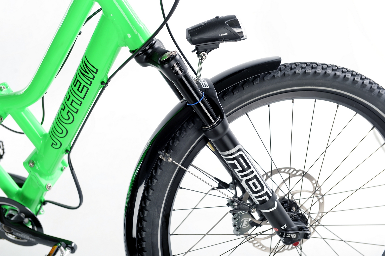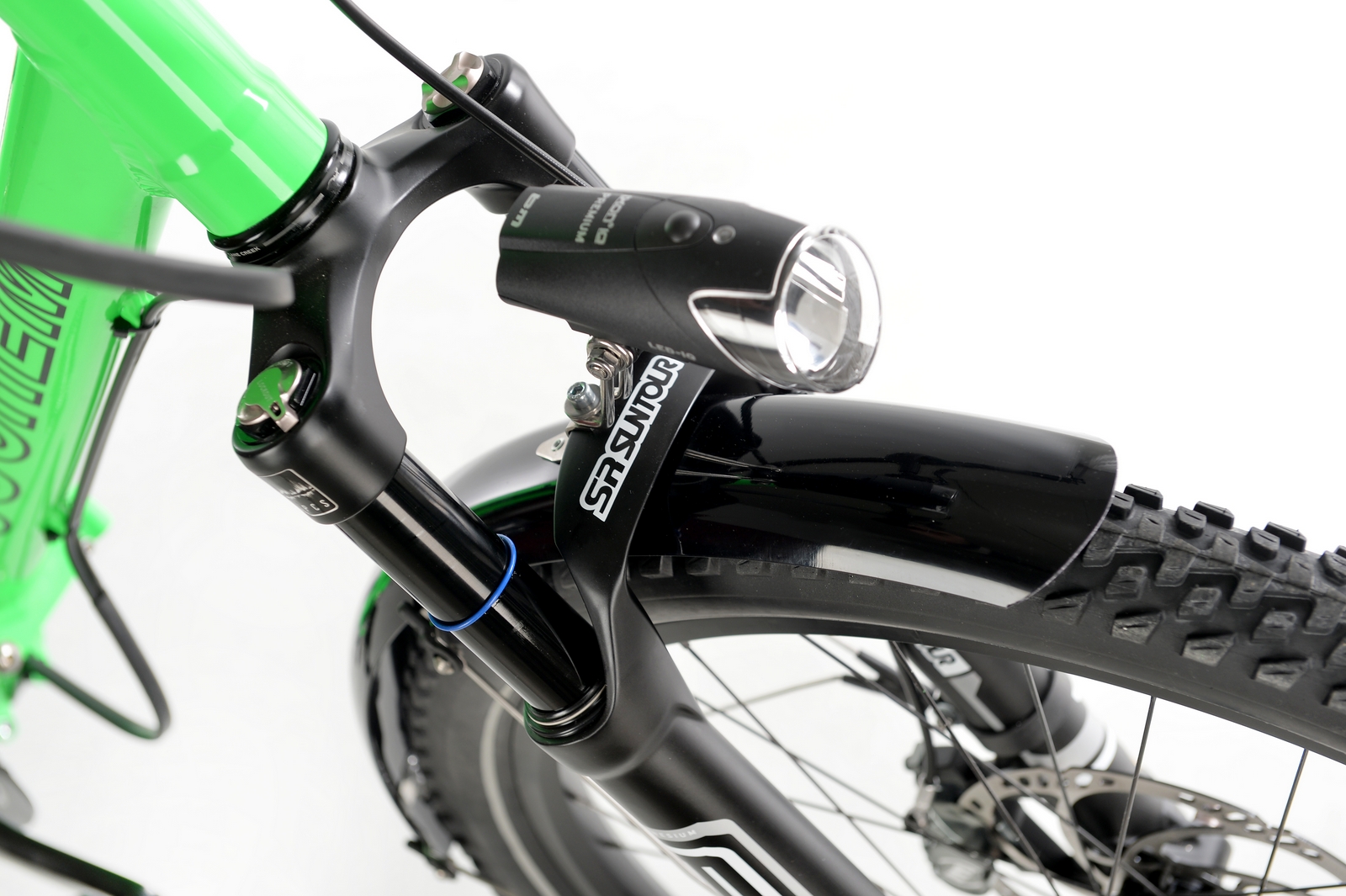 mit 100mm Federweg und 15er Steckachse mit 100mm Federweg,