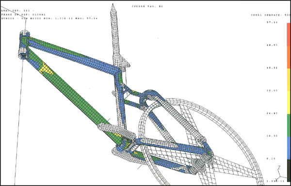 Die bike-Megalog-Messungen bringen erstmals gesicherte Wissenschaftliche Erkenntnisse. Selbst Fachleute staunen über die wahnsinnigen Belastungen beim Downhill. 131 Grad Felgentemperatur, 85 Stundenkilometer Spitzengeschwindigkeit und sechsfache Erdbeschleunigung bringen das Material ans Limit. Auch den Bereich Finite-Elemente-Berechnung machten wir uns zu Nutzen. Hier können wir Belastungen simulieren um "sichere" Rahmen zu bauen.
